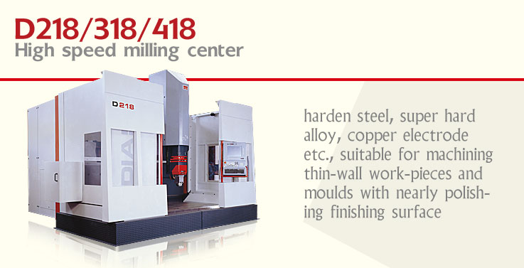 High speed milling center model D165 are machines with fixed machine bed and fixed worktable. The design of wide guide-ways and low gravity center provide high rigidity for machine, suitable for high speed movement of linear axis. Precision linear rollers and ball screws are used for the movement of coordinates. With adoption of NC driving technology, the speed of the machine can be increased from 0 to 30m/min within 0.1 sec. The key components of the machine such as motor spindle are imported from Italy to meet high speed requirement of 4000rpm for spindle. Machine with three axes or four axes are avaliable for selecting and adjusting on user's demand, five axes fuction can be realized in the case the rotary worktable is supplied. They have original performance for machining work-pieces with material of alloy aluminum, graphite, harden steel, super hard alloy, copper electrode etc., suitable for machining thin-wall work-pieces and moulds with nearly polishing finishing surface.