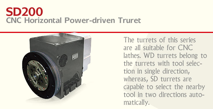 The turrets of this series are all suitable for CNC lathes. WD turrets belong to the turrets with tool selection in single direction, whereas, SD turrets are capable to select the nearby tool in two directions automatically. According to the requirements, 6-staiton turrets, 8-staiton turrets and 12-staiton turrets are available for selection. WD turrets can be divided into three specifications in center height, and SD turrets four specifications. TS turrets imported the technology from Italy, driven by planetary gears can be divided into 6-station turrets, 8-station turrets and 12-station turrets.