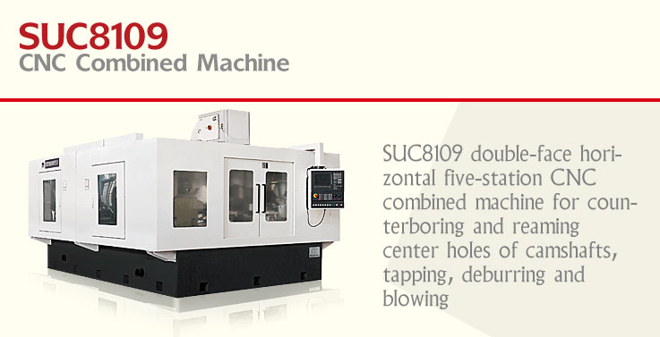 SUC8109 double-face horizontal five-station CNC combined machine for counterboring and reaming center holes of camshafts, tapping, deburring and blowing, adopts feed mechanism of one station up for loading and five stations down for unloading. The respective five sets of servomechanisms on both sides can machine (handle with) work-piece simultaneously, which are applied to counterboring center holes at both ends of camshaft, tapping screw holes at both ends, turning center taper holes at both ends, deburring holes at both ends and blowing out the chips caused during machining. The above-mentioned processes can be finished in one setting. The machine also features high automaticity, high rigidity, high accuracy and user-friendly operation, as well as suitable for volume production.